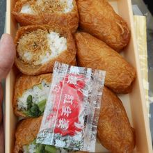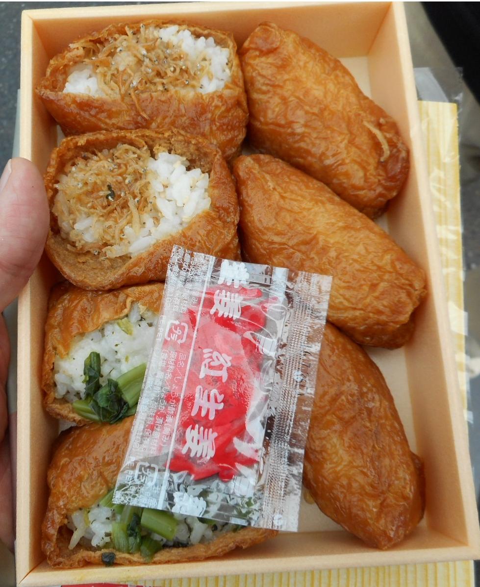 豊橋駅で名鉄からJRに乗り換えました。その際、駅売店の壺屋で「三色稲荷」を購入して食べました。内容は普通の稲荷寿司3個にちりめん山椒・ワサビ菜が各2個の計7個入りです。甘目の煮汁がジュワっと口の中に拡がって、さすが名物というお味です。同行の2人と一緒におやつとしていただきました。なお、駅売店では現金販売だけで、電子マネーは使えません。
