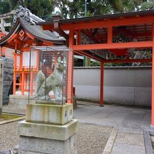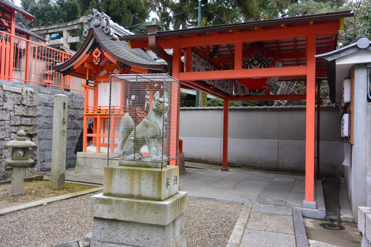 伏見稲荷大社と同様、宇迦之御魂神(うかのみたま)が祭神の稲荷社です。八坂神社の境内から円山公園へ向かう参道(南側)にあります。奥に階段があり、上ったところに命婦稲荷社の社殿もあります。これら稲荷社二社で一体とされています。