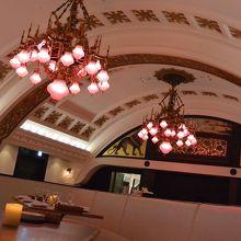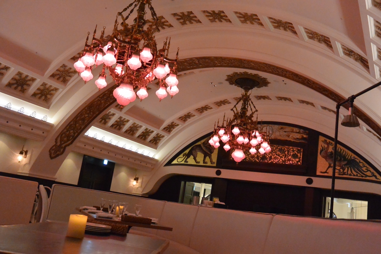 かつては阪急梅田駅のコンコースの天井だったものが移築されてレストランの一部として活用されています。装飾のデザインは伊東忠太で、歴史的にも価値が高いものです。ただそのシャンデリアの色が赤紫色で、また店内に流れているのがクラブミュージックのような音楽なので、そんな中でコース料理を頂くのはちょっと違和感がありました。もっともお料理は普通においしかったし、接客もよかったです。
