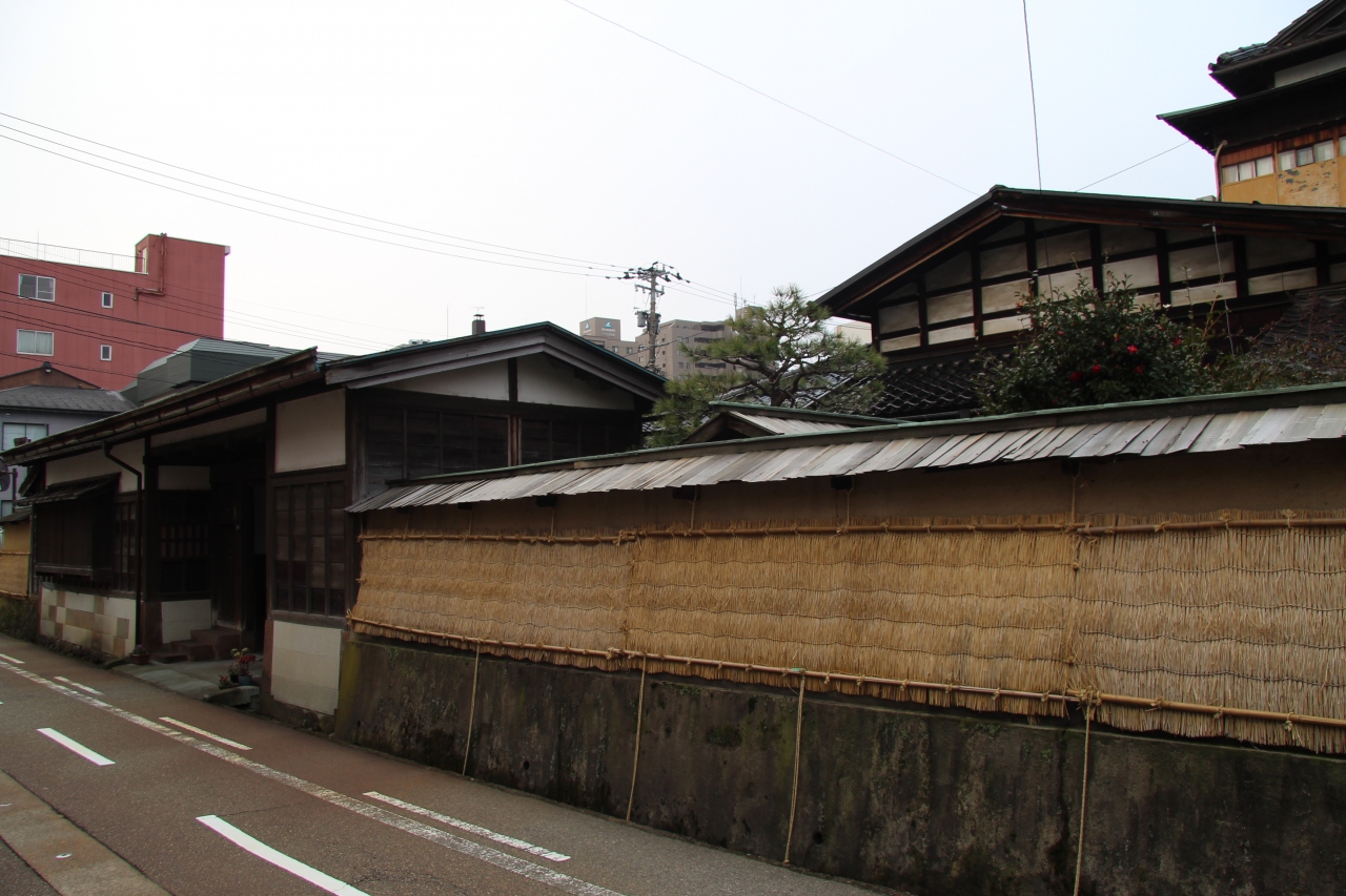野坂邸は新番組御徒小頭を勤めた禄高200石の加賀藩士の家です。藩政期末期頃の建築の様です。総延長約32間もある土塀が武家屋敷を偲ばせています。冬場に訪れたので雪の被害から土塀を守るため、こもが掛けられていて風情がありました。