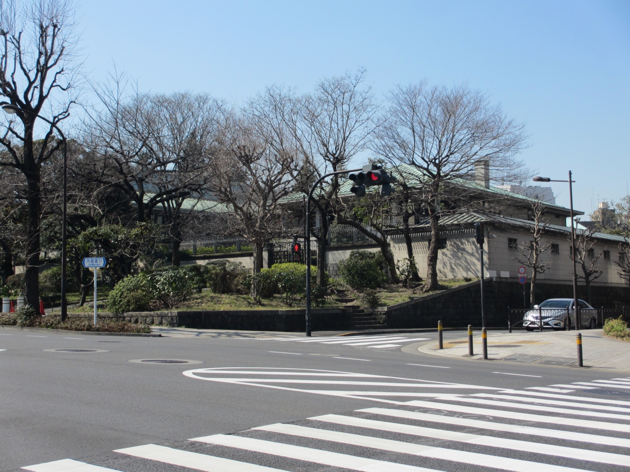 地図を片手に、靖国神社方面から千鳥ヶ淵緑道を経由し、国立近代美術館工芸館に向かう途中で見つけました。立派な建物で遠くからも目立ったので調べたところ、イギリス大使館であることが分かりました。裏側からしか見ませんでしたが、正面から見るとバッキンガム宮殿を思い出させる建物のようです。