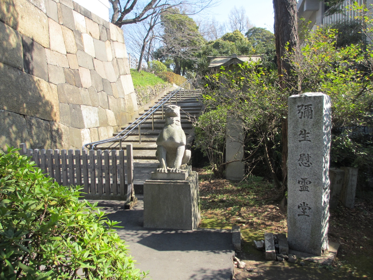 靖国通りを挟んで、靖国神社第一鳥居の向かいにある田安門を入ってすぐ左にある慰霊堂です。田安門と武道館の間にある狭い階段を上がっていった所にあります。入口には狛犬が飾られていて、神社だったころの面影を残しています。堂内には警視庁や東京消防庁の殉職者が祀られています。