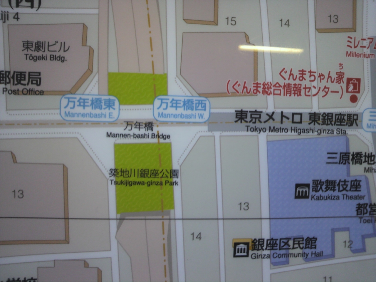 築地川の埋め立ての際、橋の傍に公園が造られ、従前の橋の名前が付けられていますが、万年橋の両側の公園だけは、銀座という広範囲を示す築地川銀座公園となっています。