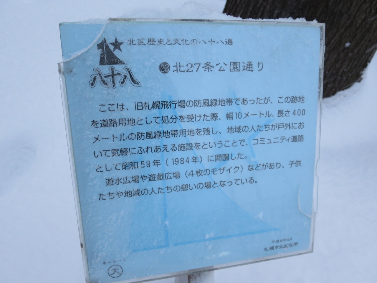 もともとは、戦前にしばらくあった旧札幌飛行場の防風緑地帯の跡地だそうで、公園の由来が公園の東端の西5丁目樽川通りの近くの小さな案内板に書いてありました。