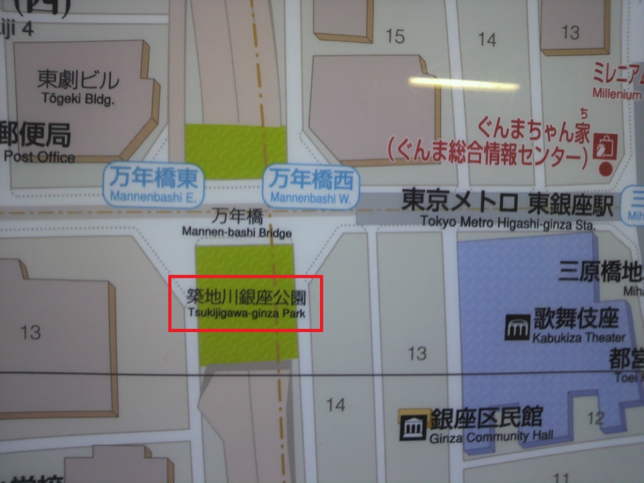 築地川の埋め立ての際、架かっていた橋の傍に公園が造られ、従前の橋の名前が付けられていますが、万年橋の両側の公園だけは、銀座という広範囲を示す築地川銀座公園となっています。