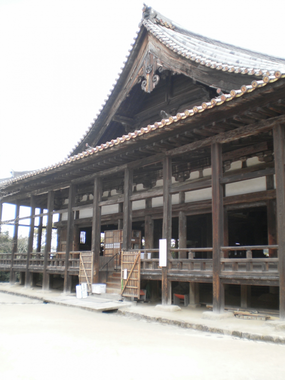 宮島の厳島神社のわきの小高いところに、千畳閣と五重塔と並んで建っています。豊臣秀吉公が建立を命じた大経堂ですが、秀吉が死んだので未完成なのだそうです。太閤秀吉を祀る豊国神社で座敷はとても広いです。 座敷に上がるのには料金がかかります。