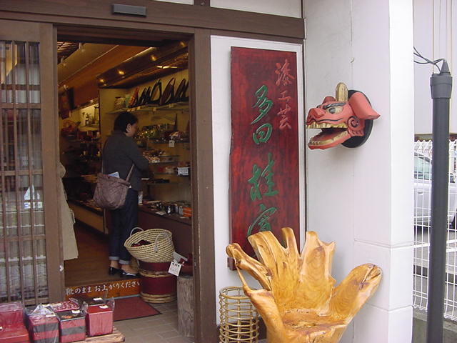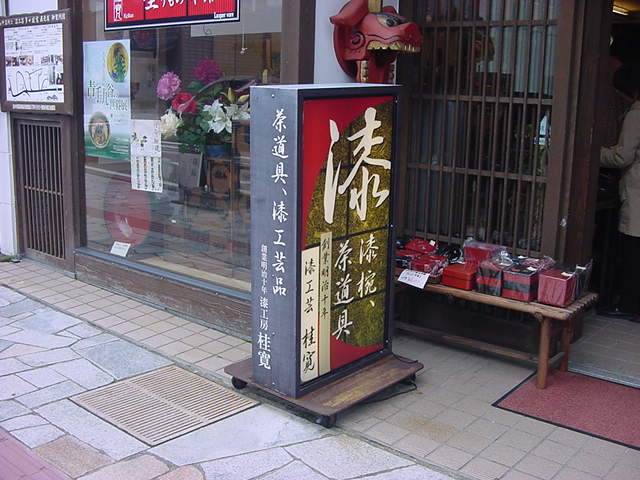 北陸新幹線の開業で観光客も増加した石川県の山中温泉にある漆工芸のお店です。山中温泉の中心と言えるからくり時計のすぐ脇にあって、多くの観光客でにぎわっていました。鮮やかな色合いの漆器を店内で販売。土産物としても喜ばれます。