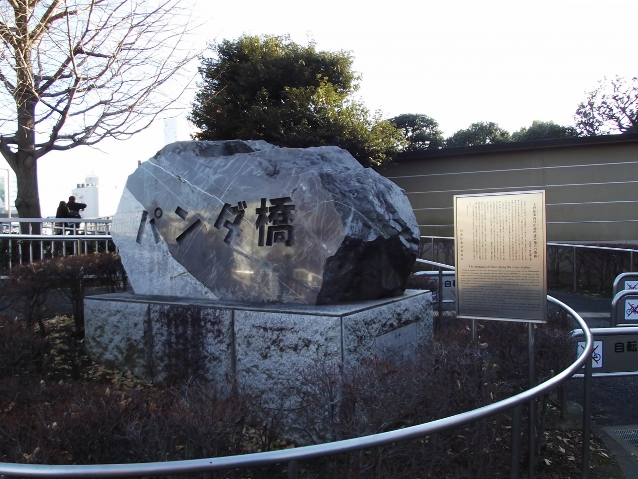 そのため、この東西自由通路であるパンダ橋の建設地点の遺跡についての説明板が、橋名を刻んだ大きな白黒石の脇に立ててあります。