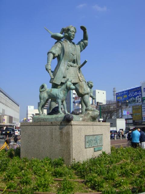 岡山の英雄と言えば「桃太郎」です。右肩に鷹、両脇には犬と猿を従えた桃太郎の像が岡山駅前にありました。岡山には各地に桃太郎像が設置されていますが、ここの桃太郎が一番イケメンのようです。また台座はベンチになっており、この日は冬でも暖かったのでおじさんが昼寝していました。