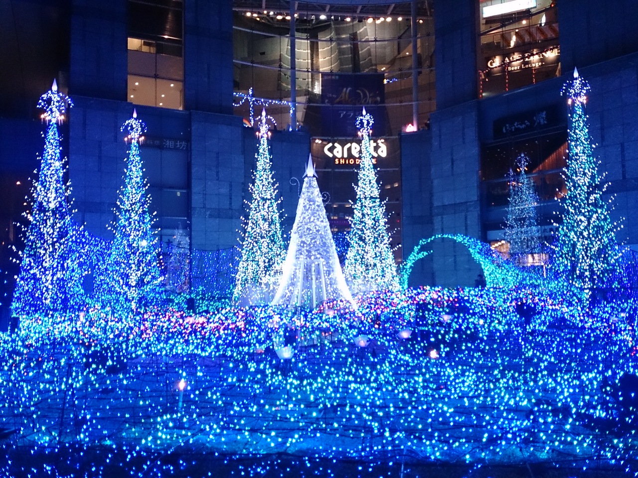 広場で行われていたイルミネーションショーがとても綺麗でした。時間になると、音楽に合わせて色が次々に変わり、思わず何回も時間を変えてショーを見てしまうほど。2月に劇団四季を見に行った帰りにたまたま見ただけだったのですが、予想外に美しく、必見だと思います。