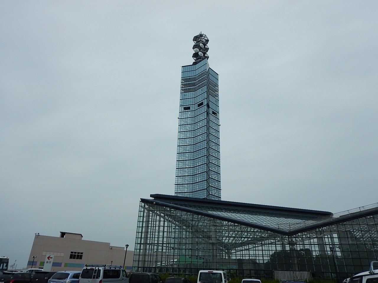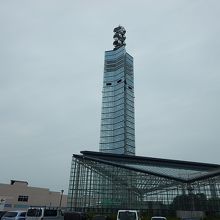 高さ143m、全面ガラス張りで空を映したブルーの姿は遠くからでもよく目立つ。