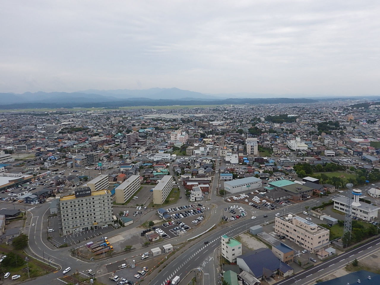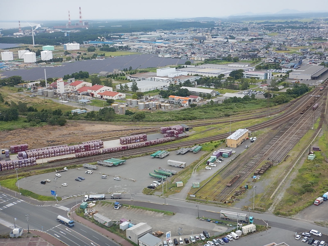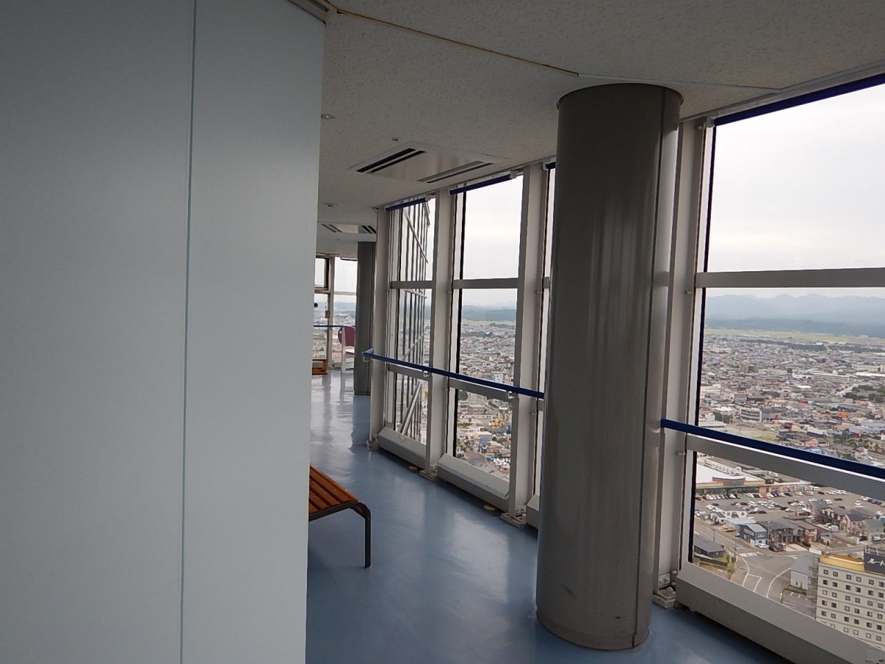 展望室からは秋田港を見渡すことができ、コンテナを運ぶ貨物線も小さくなるほどの高さである。