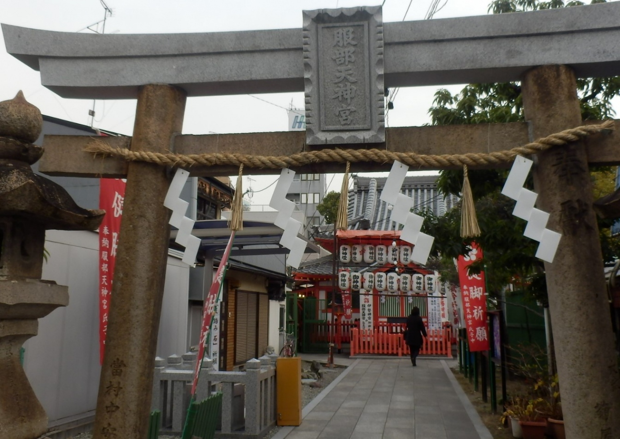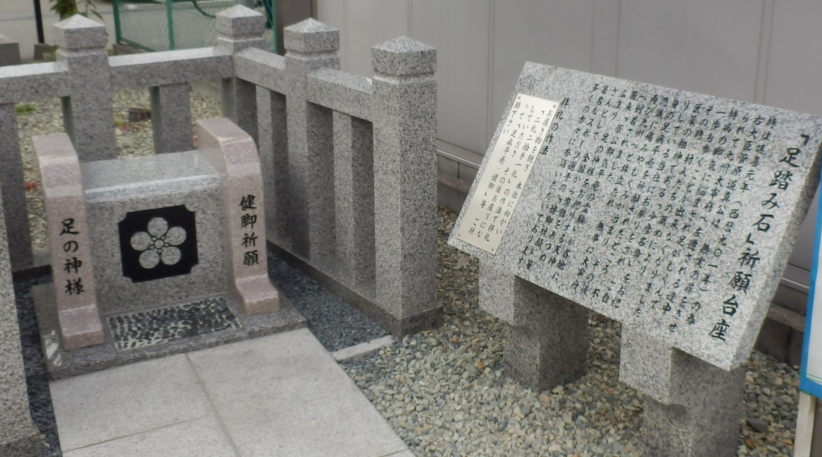 豊中市の服部天神は足の神様と言われている。菅原道真公が大宰府へ左遷される途中でこ服部で足が痛んで歩けなくなり医薬の祖と言われていた少彦名命を祀る服部天神社で足の回復を祈願すると痛みが解消し無事大宰府へ到着されたとされている。健脚を祈願する参詣者がおとづれている、神社入口に石の台座が置かれておりこれに足を載せ本殿の方を向いて祈願すれば足の病気が回復するとされています、台座は一つしかないので平日の朝など参詣人の少ない時に行かれることをお薦めします、参考資料*神社が境内に設置した説明の石碑