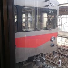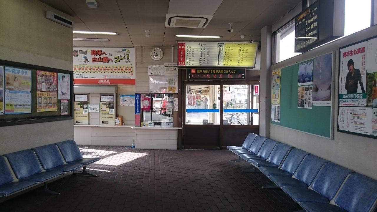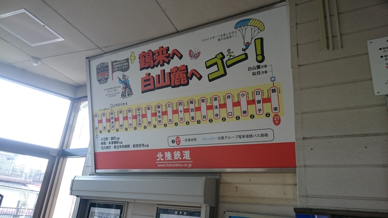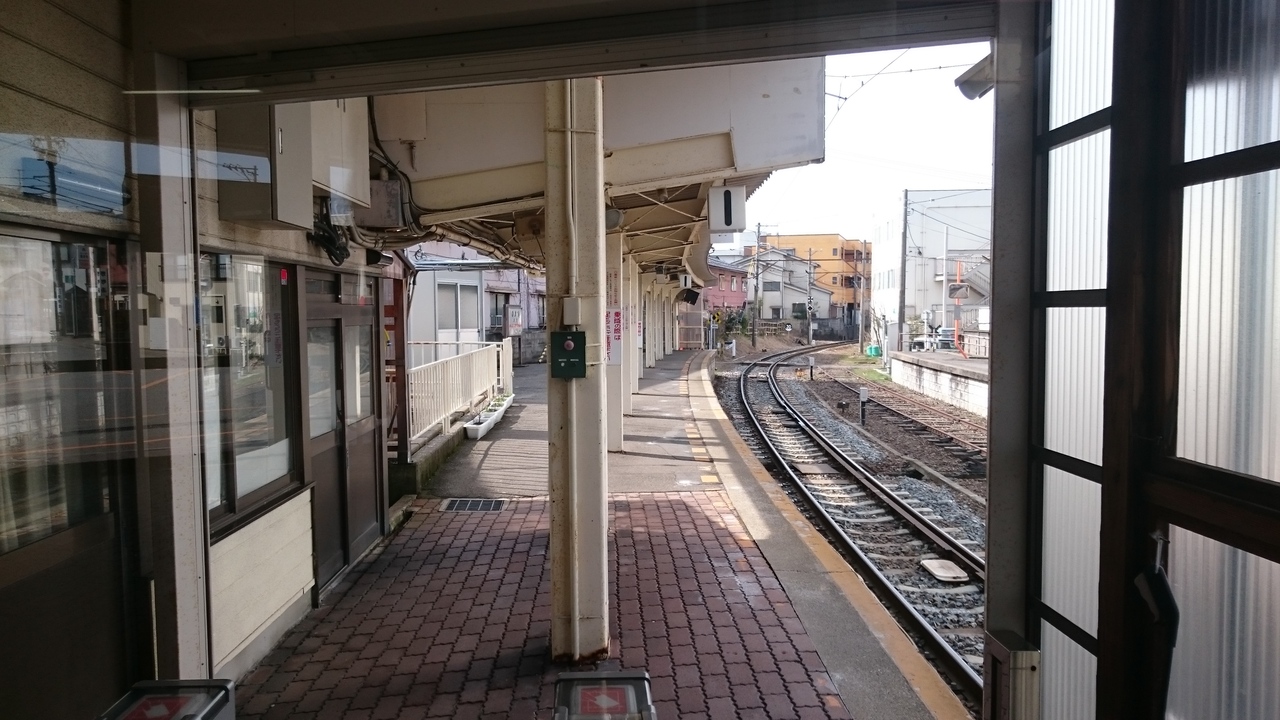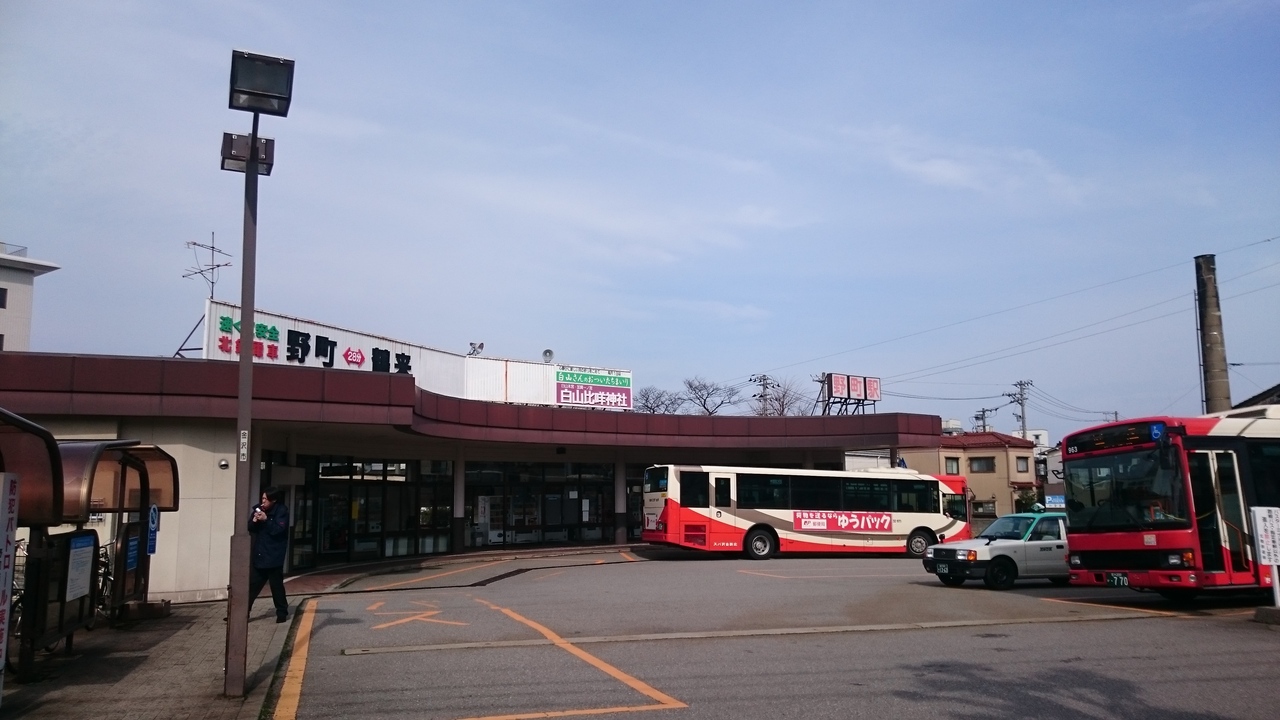 北陸鉄道石川線の始発駅。国道157号線の裏手にあり、繁華街の片町からは1キロくらい離れています。その分、バスの接続が考慮されており、金沢駅西口・県庁行きのシティライナーをはじめ、武蔵ヶ辻・柳橋方面、野々市方面への路線が運行されています。ホームは1番線と2番線がありますが、現在、2番線は使用されておらず、線路も一部は外されています。ホームが急カーブしているところに駅があるので、ホームと電車の間に空間があるので、足元に注意が必要です。