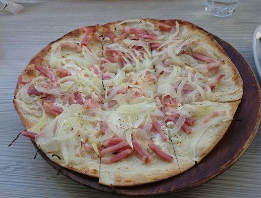 東京メトロ東西線の神楽坂駅1番出口の近くにある、フレンチレストランです。白を基調とした店内は明るくカジュアルな雰囲気です。平日のランチタイムでしたがほぼ満席、カウンター席のみ空いてました。混雑時にもかかわらず、彩り豊かに盛り付けされた前菜とスープが、そしてタルトフランベが、一度に…。少し時間ずらしてくれても…。