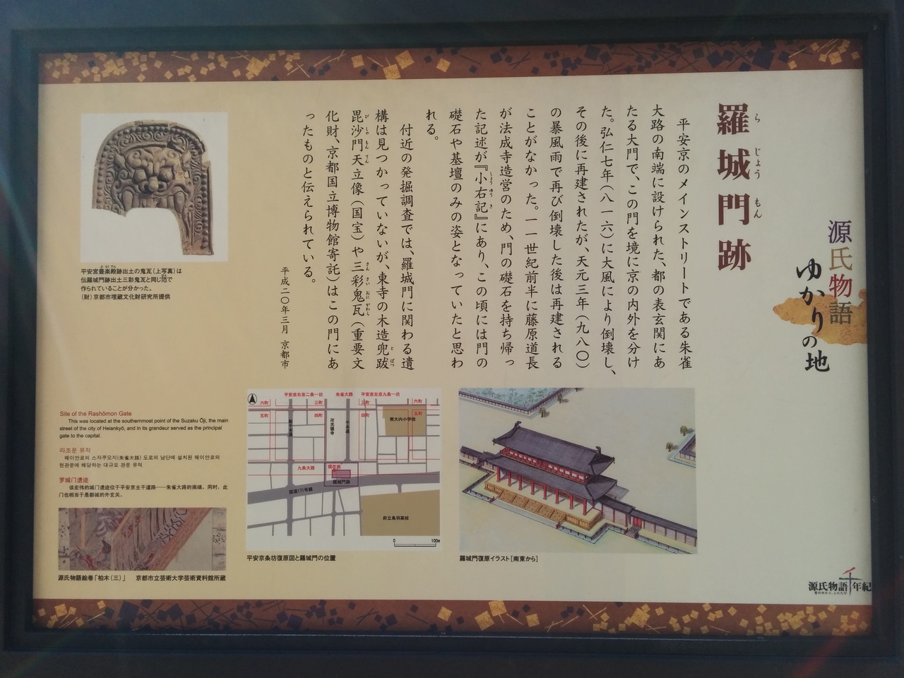 「東寺」南門前の九条通りを西に向かい、千本九条交差点手前100メートルの右手に平安京時代の大門「羅城門跡」の石碑が設置されている公園がありました。