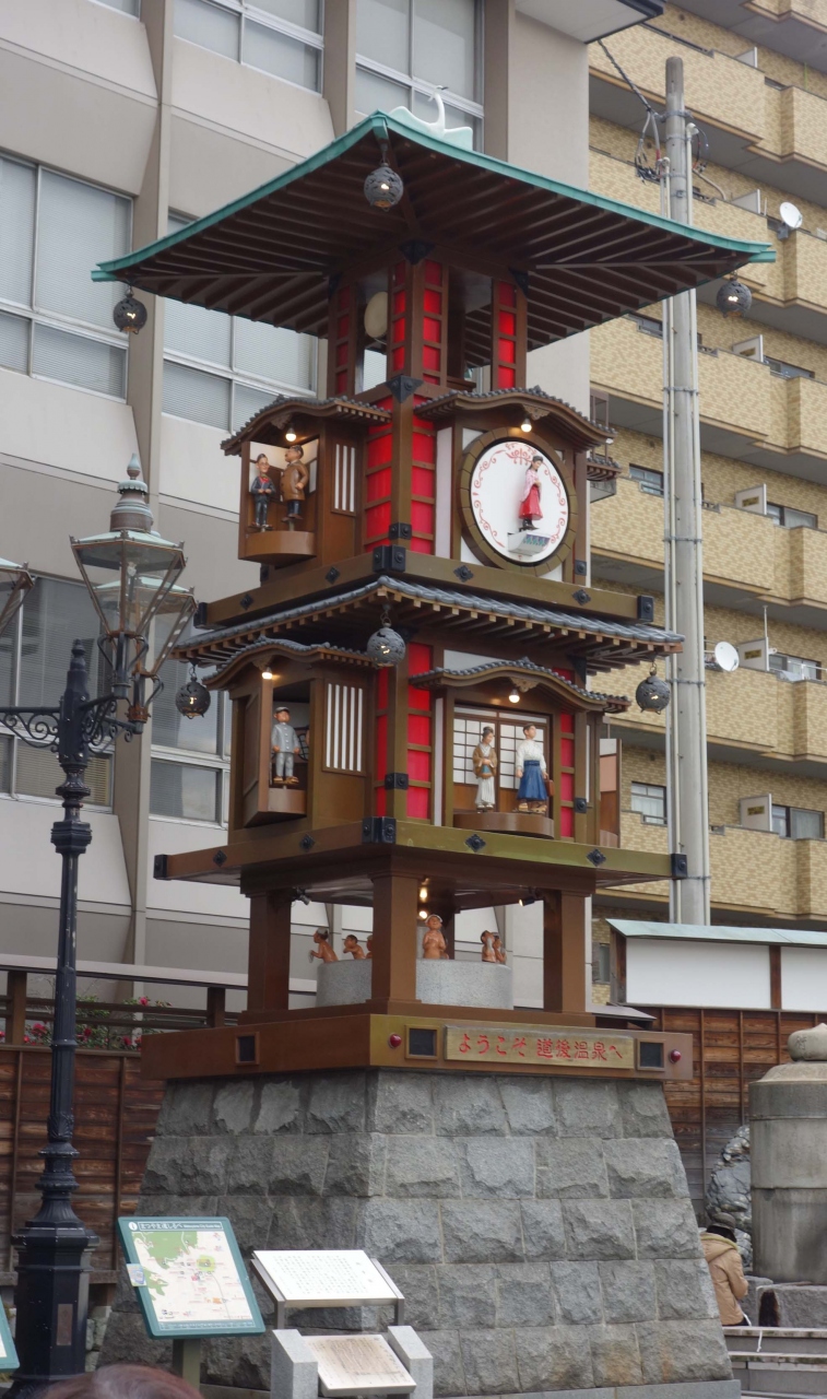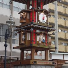 道後温泉駅のアーケード商店街の入口に建っています。結構有名な撮影スポットらしく定時になって時計の仕掛けが動くのを待っていました。丁度良い時間だったので少し見ていました。あまり派手な動きはありませんでした。