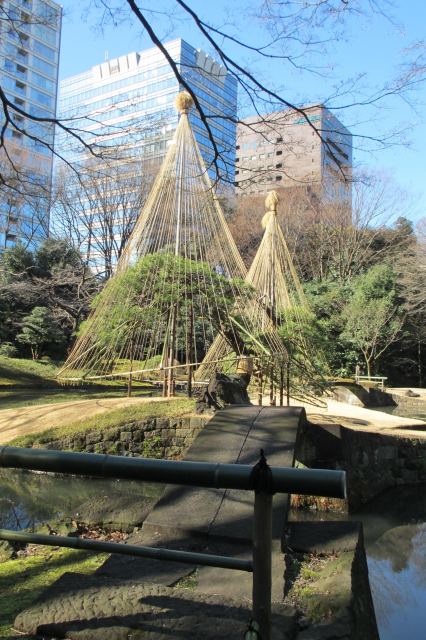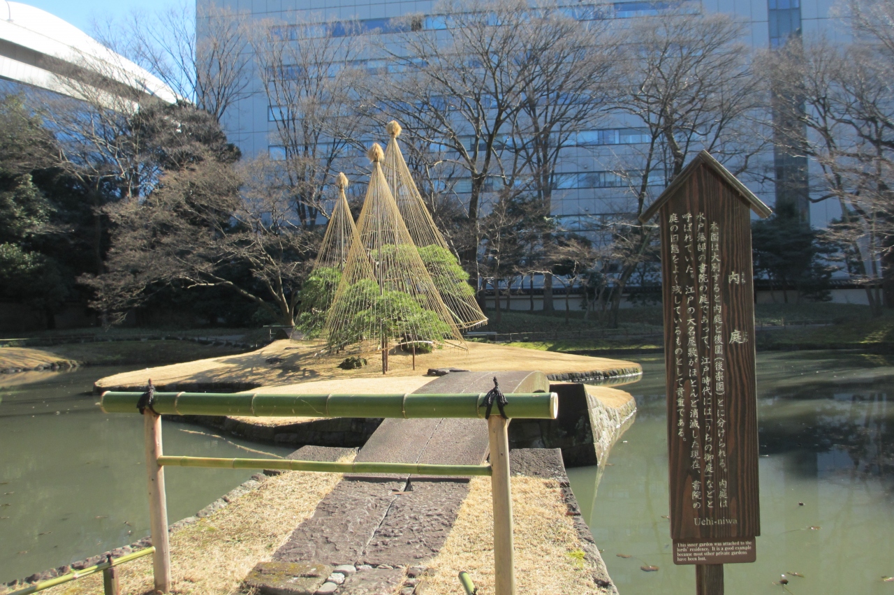 池の真ん中に島があり二つの橋で結ばれています。雪吊りがしてありました。東京ドームの屋根が池に映っています。