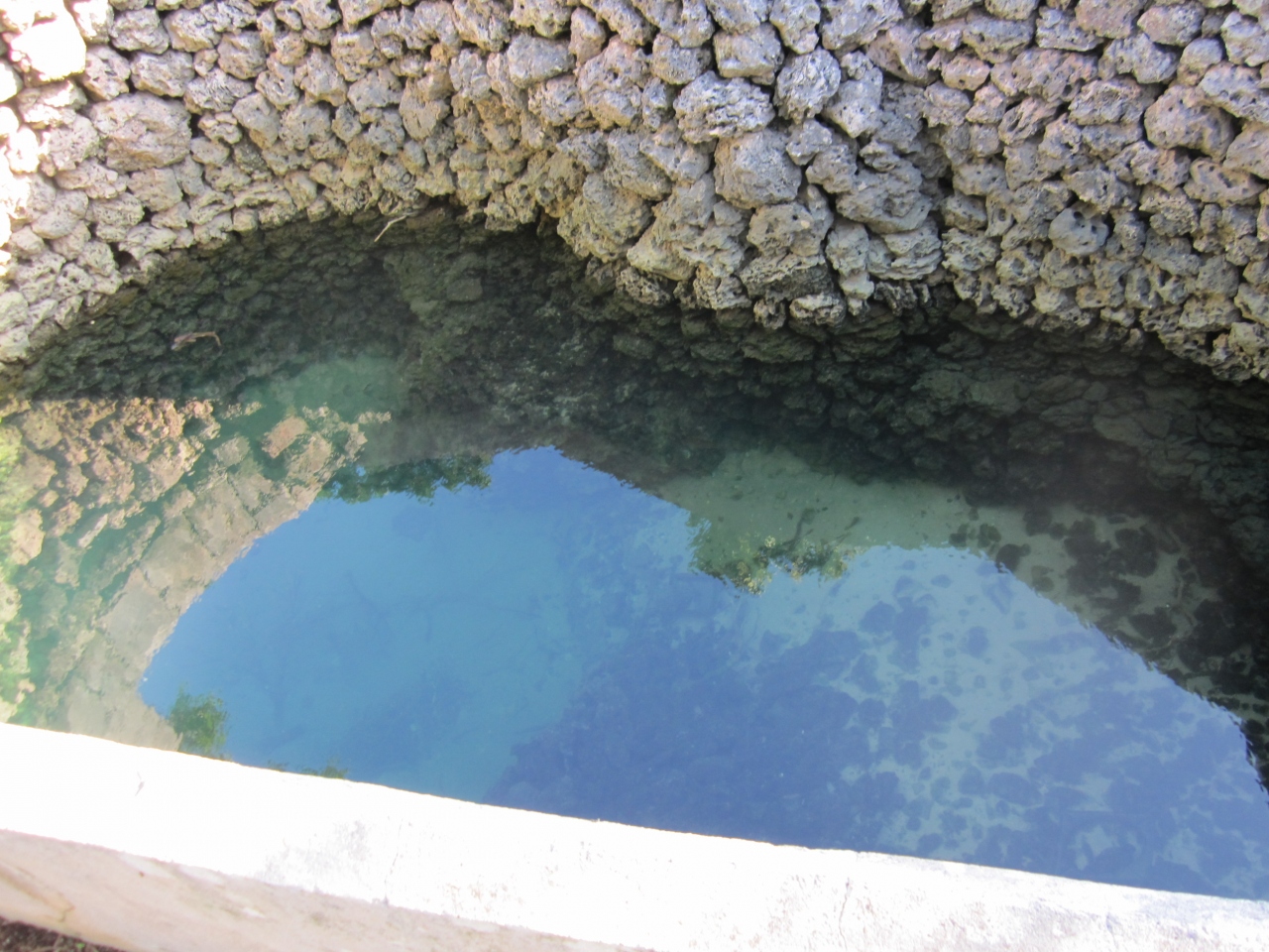 水が実際に溜まっている部分は石垣になっていて、その上部はコンクリートで囲われていました。井戸の底がはっきり見えていたので水深は浅かったですね。井戸から少し離れた傍らには、井戸の由来などを説明している銘板が設置されていました。