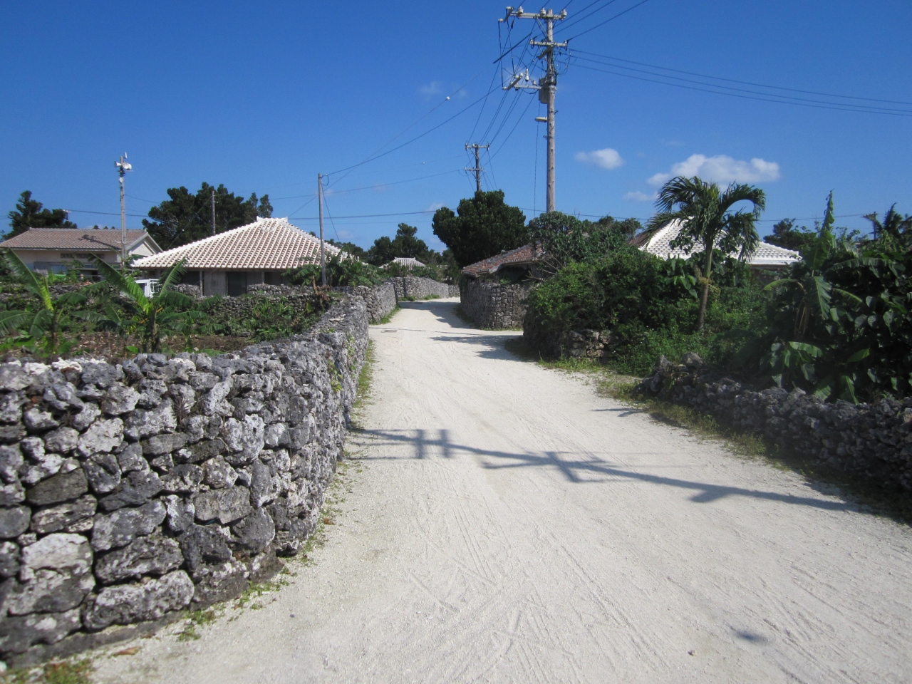 島の中にある道は、港からの1本道やトラックなどが通る外周道路を除いては、さらっさらの白砂が全面に敷かれています。観光客を乗せたワゴン車や小型バスが走った直後に多少の砂埃が立ち上がりますが、散歩するには歩きやすく、特に東の集落には見所が点在していました。