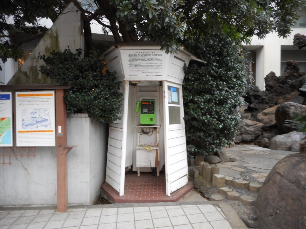 大湯間歇泉横にはちょっと古風なボックス公衆電話があります。こらは、市外通話が日本で初めて熱海~東京間に引かれたことを記念して設置されたものです。明治の頃には、熱海は政治家が静養に訪れる名所でした。その政治家が東京へ連絡するために市外通話回線が必要だったのですね。なお、この電話は今でも使えますよ。