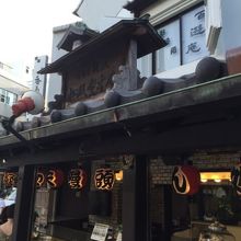 蔵造りの建物の下に瓦屋根で、赤い提灯がぶら下がって昔ながらの風情ある雰囲気です。