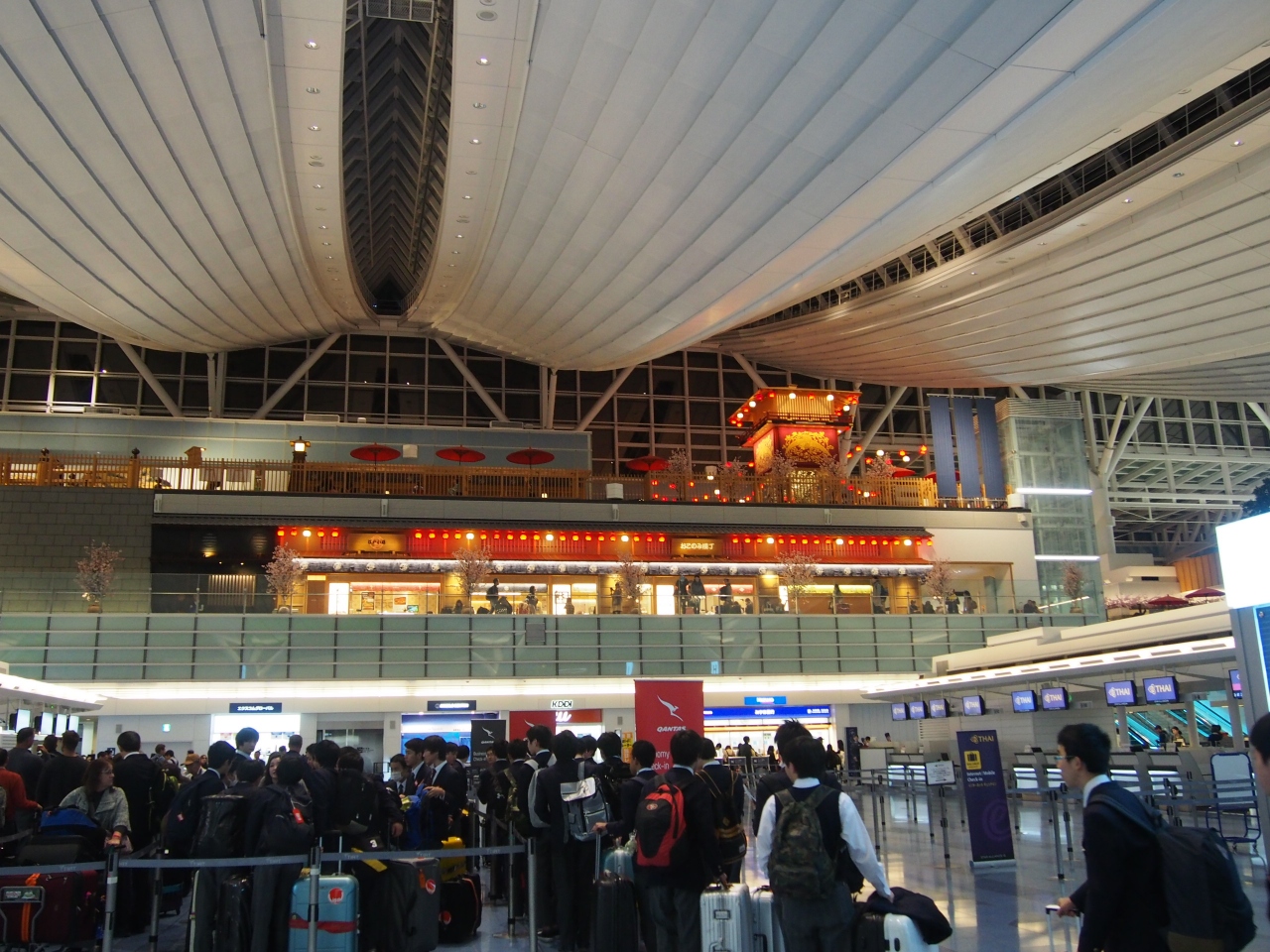 たまたまでしょうが、修学旅行生がわんさか。どうみても高校生。良い時代になったものです。若いころから外の世界を見ることは良いことだと思うのですが、振り向けば中国人の団体客。いろいろ考えさせられます、国際線。