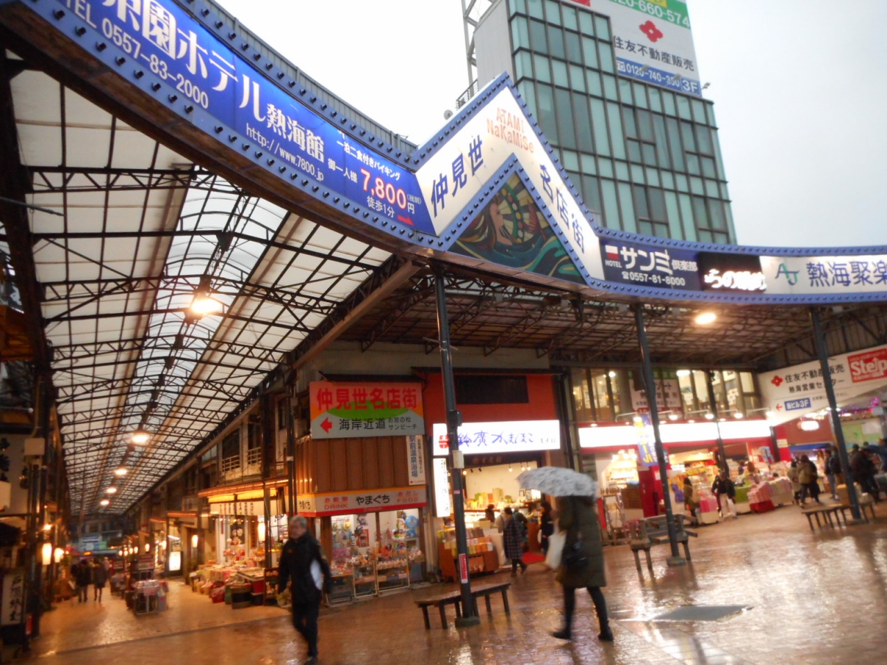 熱海駅前には2本のアーケード商店街があります。そのうちの1つが仲見世通り商店街です。駅前ロータリーから続く道路の両脇に、飲食店や名産品の店が並んでいます。アーケードの入り口に派手で大きな看板軒があるので、熱海駅に着いたらまず目に着きますよ。