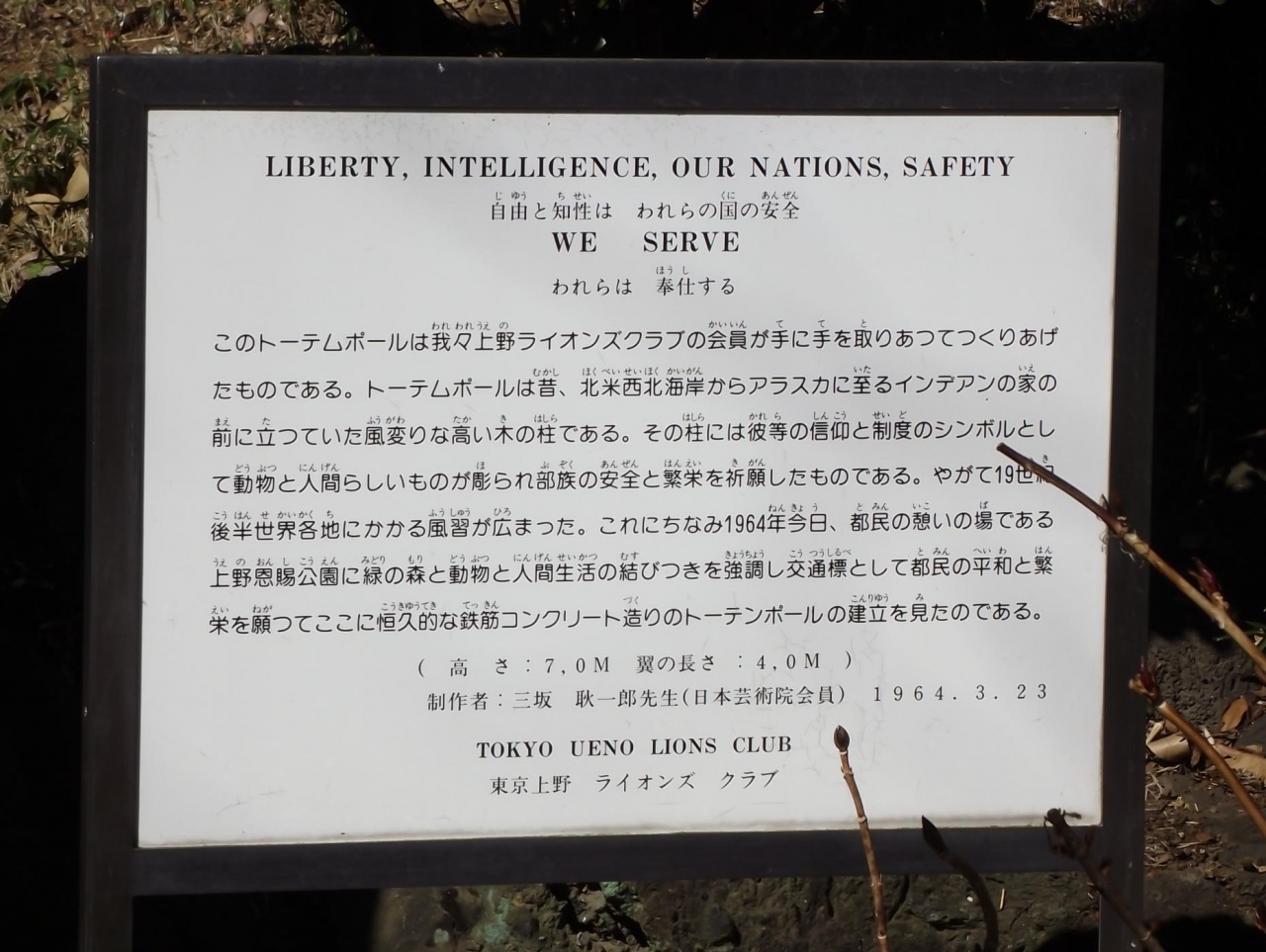 上野ライオンズクラブの会員が手に手を取りあってつくりあげた鉄筋コンクリート造りで、高さ 7.0m、翼の長さ 4.0mのトーテムポール とのことです。
