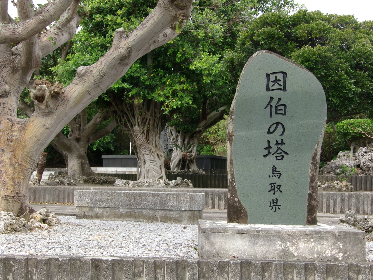 米須霊域の魂魄之塔脇を通り過ぎ、少しカーブした場所にある因伯の塔は、先の大戦で亡くなられた13,904柱(沖縄戦戦没者:539柱・南方諸地域戦没者:13,365柱)の御霊を祀る慰霊碑として昭和46年11月4日に建立されました。日本四大庭石とされる鳥取県産の佐治石が使われており、その台座には県下全市町村の石がちりばめているそうです。