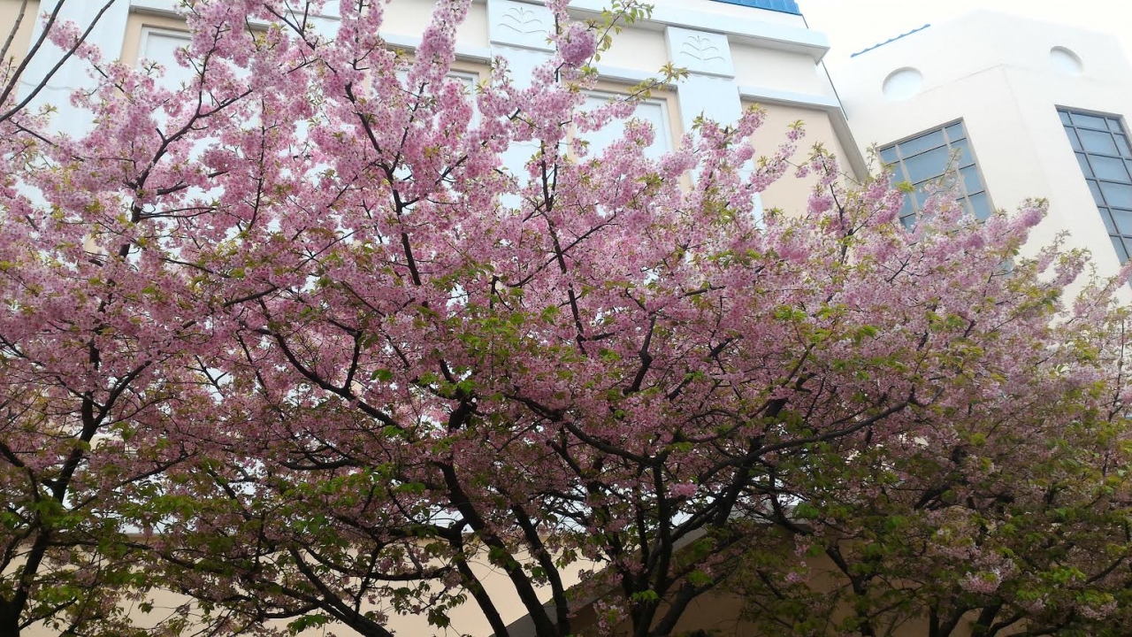 イクスピアリ内にあるリリーボンドガーデン(中庭)には数本ですが河津桜の木があります。濃い色のピンクと葉っぱのみどりがとてもステキで、今がちょうど見ごろです。もう少し木の数があればお花見にぴったりだと思います。