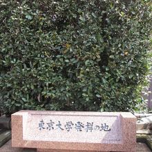 神保町駅から徒歩1分です。学士会館の皇居寄りの入口右手前植え込みにあります。明治10年この地に東京開成学校と東京医学校が合併して東京大学が創立されました。明治18年に本郷へ移転するまで法学部、理学部、文学部、医学部、工芸学部などが置かれるようになりました。明治19年に帝国大学と改称され法・医・工・文・理・農の六分科大学と大学院からなる総合大学になりました。以降明治30年に東京帝国大学、昭和22年に東京大学と名称が変わりました。