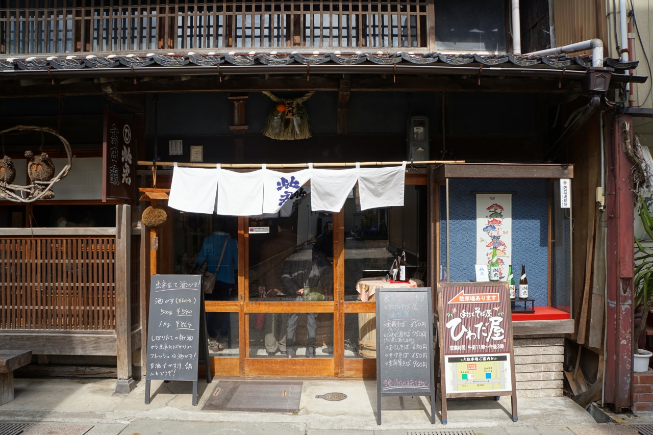 高田酒造は、白壁の土蔵群の中心。裏通りの小川に面して長く続いた白壁の建物は、ここの建物です。ブランドは「此君(しくん)」。中国の故事から取ったものだとか。