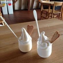 ドーナツにプリンにソフトクリームのお品書きに迷いつつプリンの上にソフトクリームがのっているのを注文。