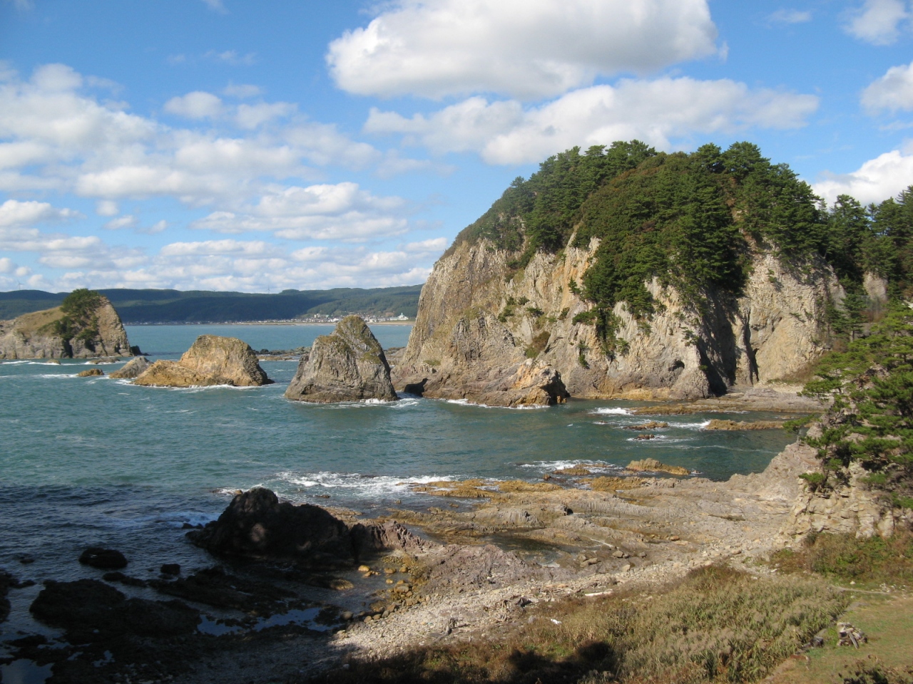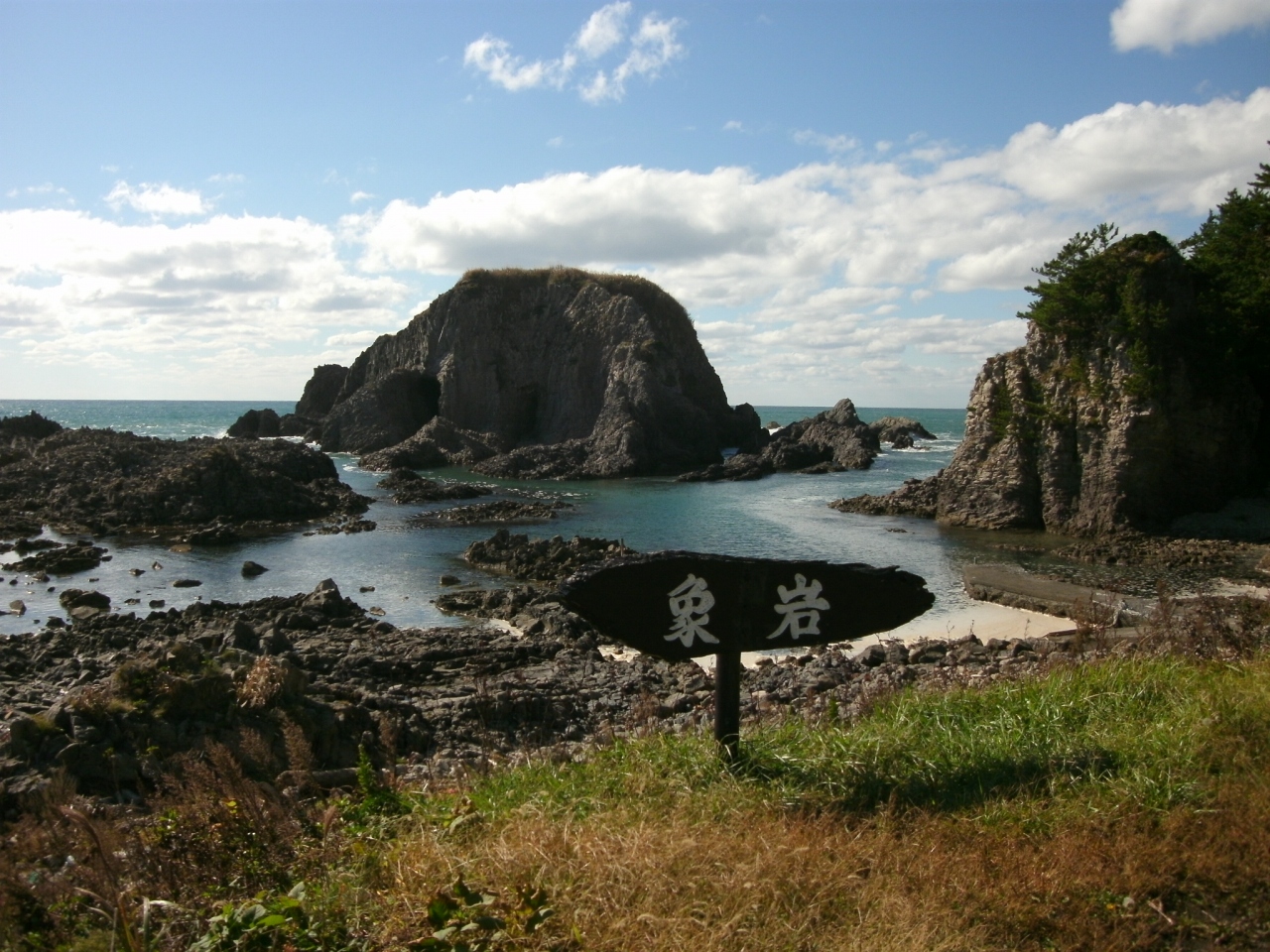 白神山地を望む岩場の海岸です。象の顔のような形をした“象岩”などの奇岩が並び、岬の先端には数多くの小石を積んだ供養塔が建つ「賽の河原」と言われる民間信仰の地がありました。現地に30分ほどいましたが観光客を見かけることはなく、寂しい海岸でした。有名な観光スポットである十二湖から近いので、十二湖散策のついでに訪れられると良いでしょう。
