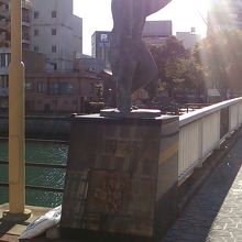 欄干部分に阿波おどりの躍り手の像が飾られている新町川に架かる橋