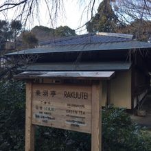 新宿御苑の日本庭園の梅林の中にある茶室です。立礼席で点出しで呈茶を行っており、簡単な和菓子付きの抹茶は一服700円でした。