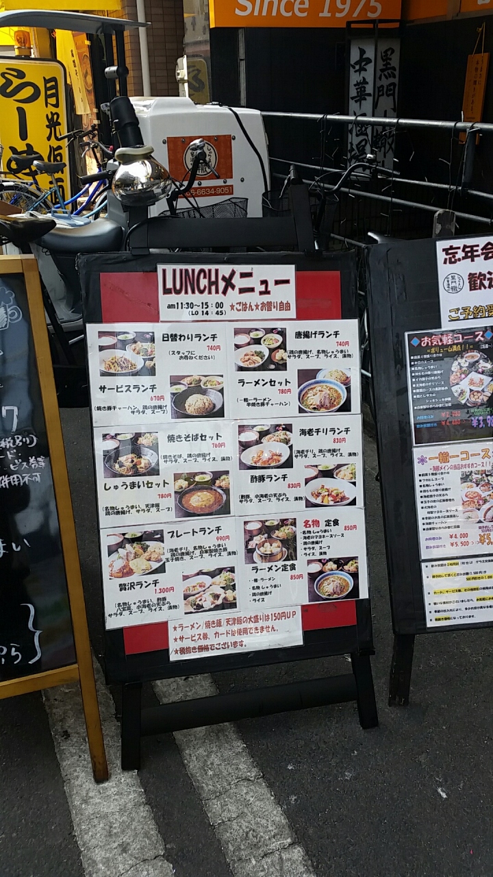 ランチメニューは、写真のとおり豊富。今回は、TVでも紹介してた「シュウマイ定食」を注文。満席のため少し時間がかかったが、実物はボリューム満点。シュウマイ定食と言いながら、シュウマイ3つだけ。その他、スープに鳥唐揚げ、メインとしか思えないゴッツイ天津飯。