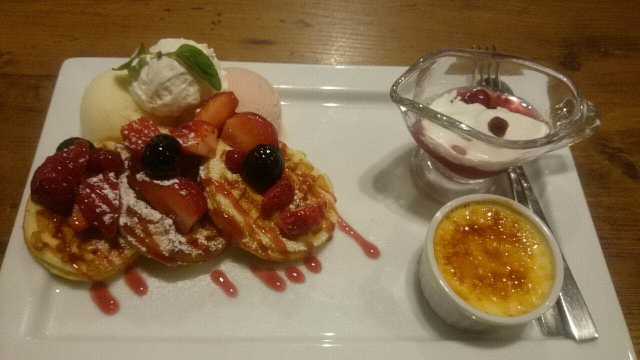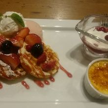 よく並んでるのを見かけていたので、気になっていました。平日の17時頃でしたが、タイミングよく帰る人達が何組かいて、すぐ座ることができました。出入口すぐのゆったりした席に案内されました。お店外からはゆったりした席しか見えませんでしたが、奥の席は隣のテーブルとの間隔の狭い席でした。ゆったりした席に案内されて、良かったです。ワッフルやプリン等がのったプレートを頼みましたが、とても小さいワッフルです。280円のワッフルもあるのですが、これよりはワッフルが大きいサイズなのかと思っていたら、同じ大きさでした。私はコーヒーを頼みましたが、フルーツティーも美味しそうでした