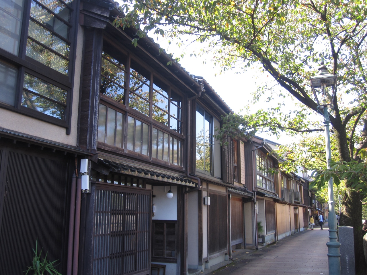 ひがし茶屋街から浅野川を挟んで主計街茶屋街があります。(かずえまちちゃやがいと読めませんでした。こちらは今でも料亭や旅館としての営業が多く、お昼間はひっそりしてましたが、人もまばらで、風情のある街並みをゆっくりと見ることができました。