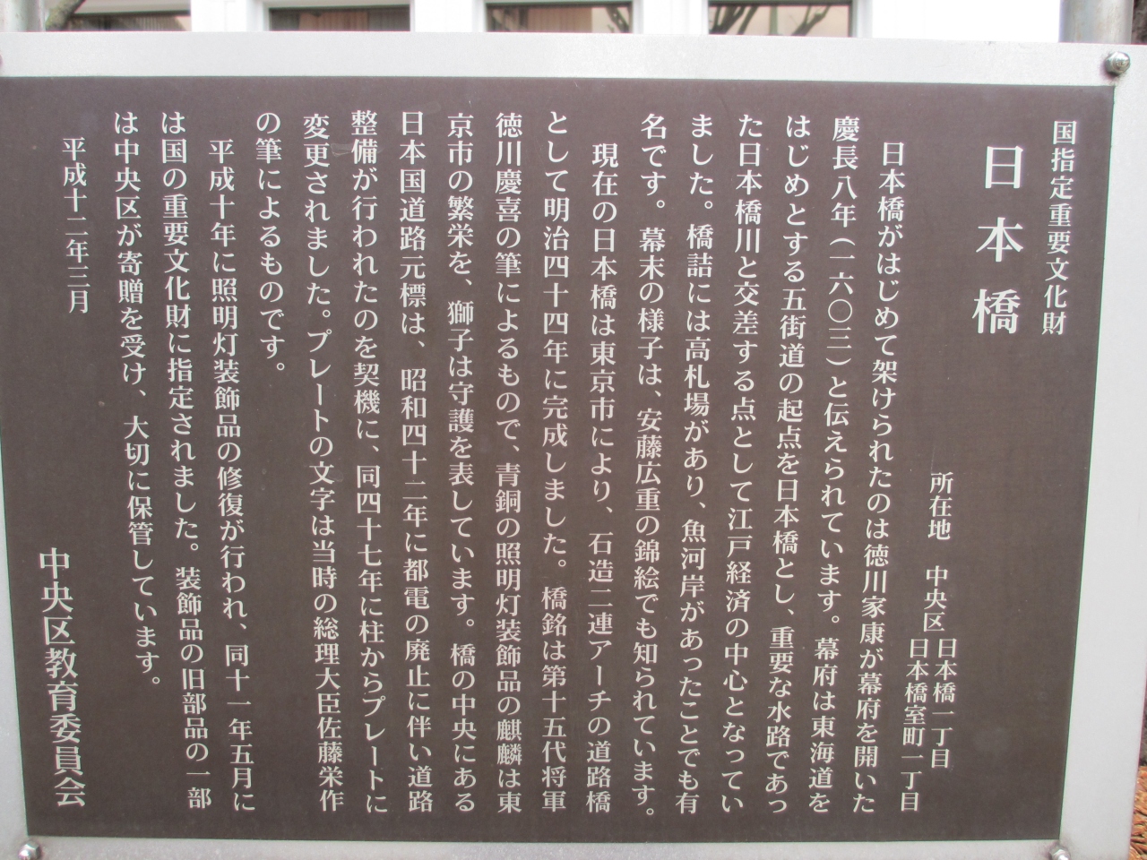 日本橋のたもとに石碑と説明板が建っています。説明板には、五街道の起点を日本橋にし、1603年に橋が架けられたと記されています。現在の石造二連アーチの道路橋は明治44年に完成、橋銘は十五代将軍徳川慶喜によるものだそうです。