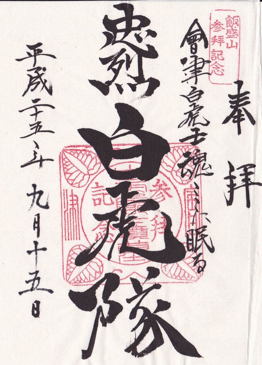 白虎隊自刃の地として有名な「飯盛山」、ちょうど大河ドラマ『八重の桜』を放映している時期だった為、大変混雑していました。こちらの飯盛山のお土産屋で頂けるのが「白虎隊の御朱印」です。もちろんこちらは神社・仏閣ではありません。