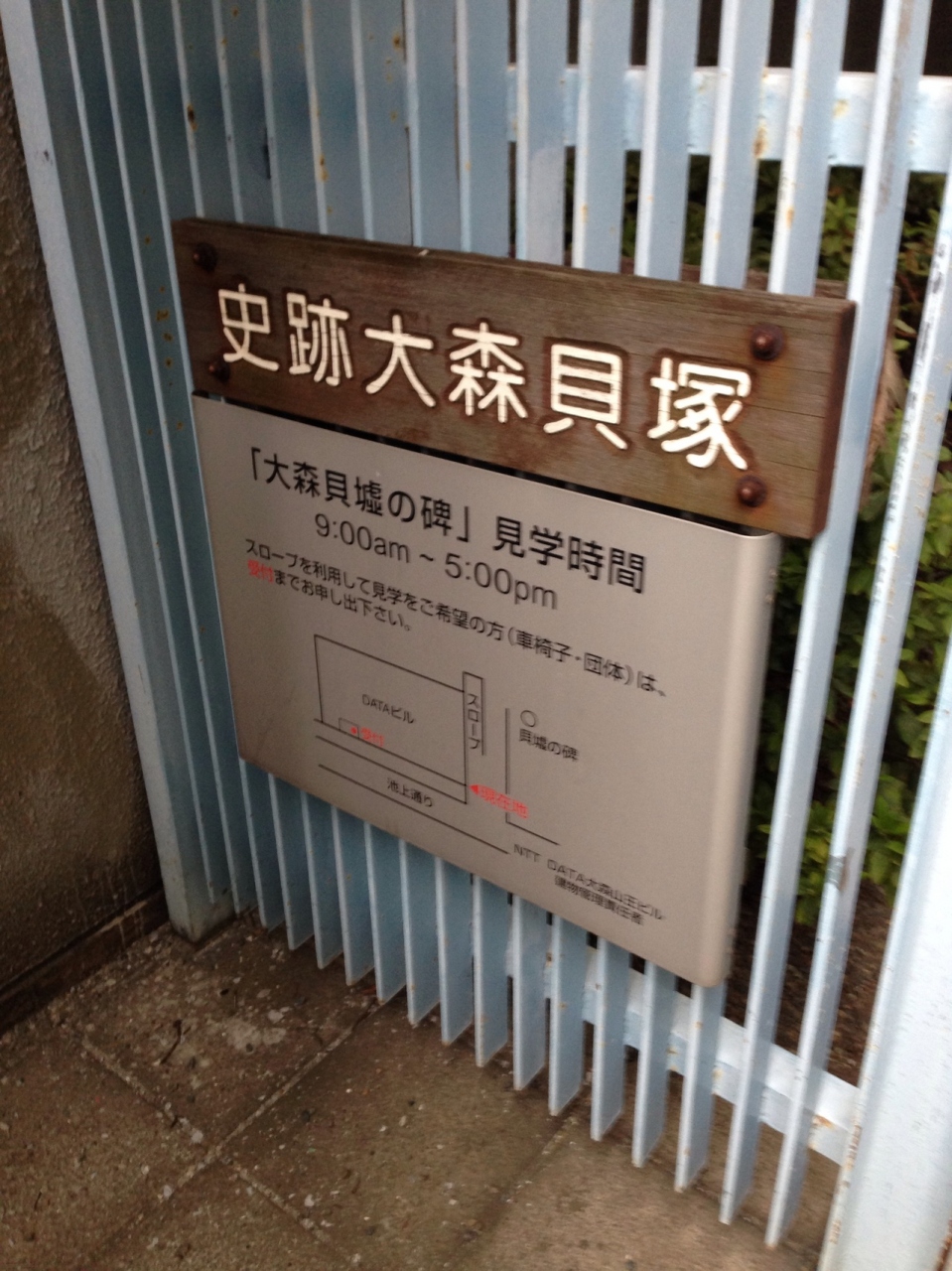 大森駅を池上通り沿いに大井町方面に進むとやがて見えてくる 貝塚の文字と貝殻の石碑。これはレプリカとの事でその脇に本物へ続く道がありました。