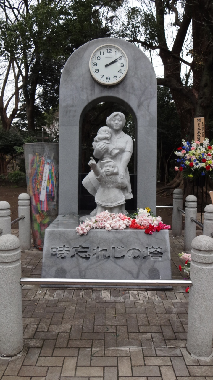 時忘れじの塔は「東京大空襲」の犠牲者を悼む慰霊碑です。落語家の故林家三平さん夫人海老名香葉子さんらにより建てられました。空襲で亡くなられた家族がモデルだそうです。清水観音堂脇、上野公園内いこいの広場にあります。