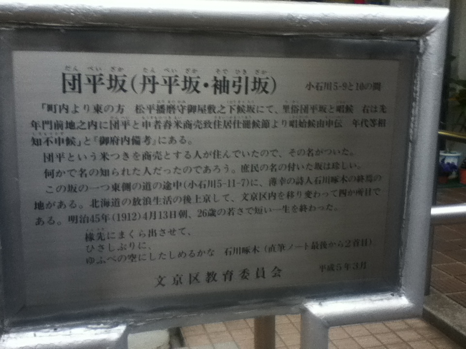 地下鉄茗荷谷駅の東側、竹早公園や小石川図書館の南東側にある。坂は公園から北東方面へ下がっていて、両側に歩道がある。週末午後、自動車は少ないが、図書館に来る人が数人歩いていた。坂の説明板が図書館の前に立っている。坂の名称は、団平という米つきを商売とする人が住んでいたことが由来らしい。近くの播磨坂桜並木等の観光スポットと併せて訪問するのもいいかもしれない。