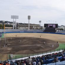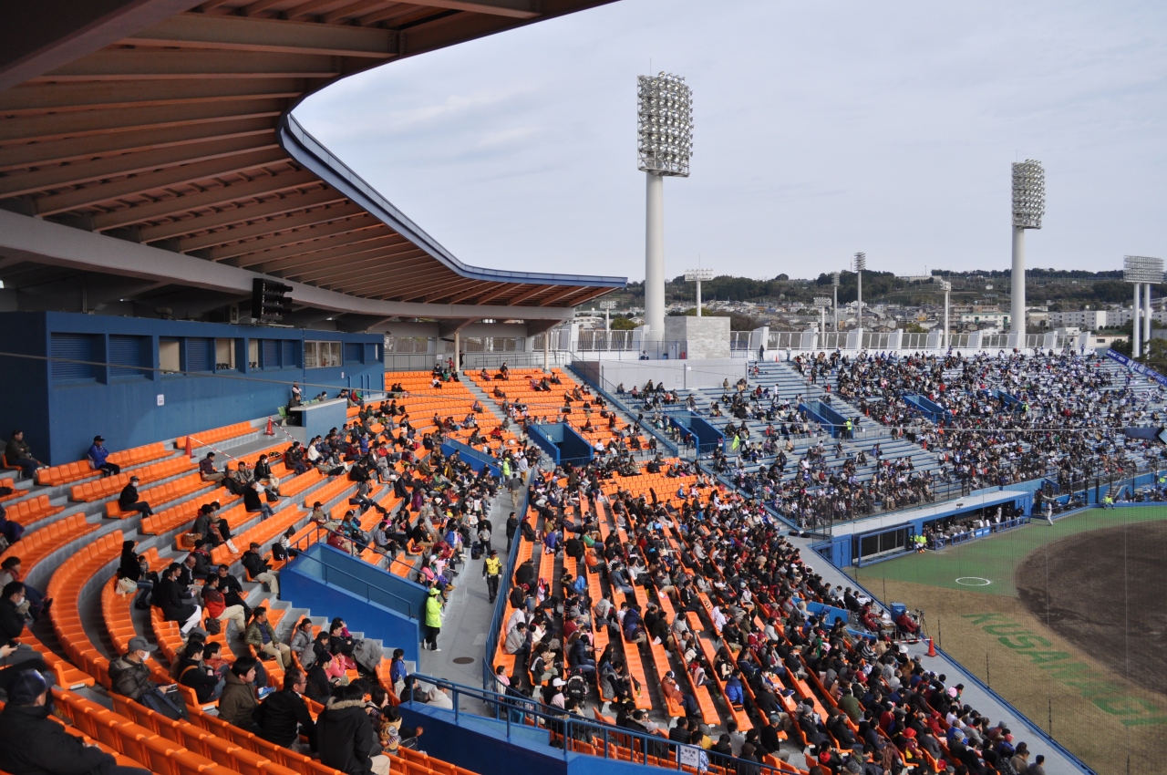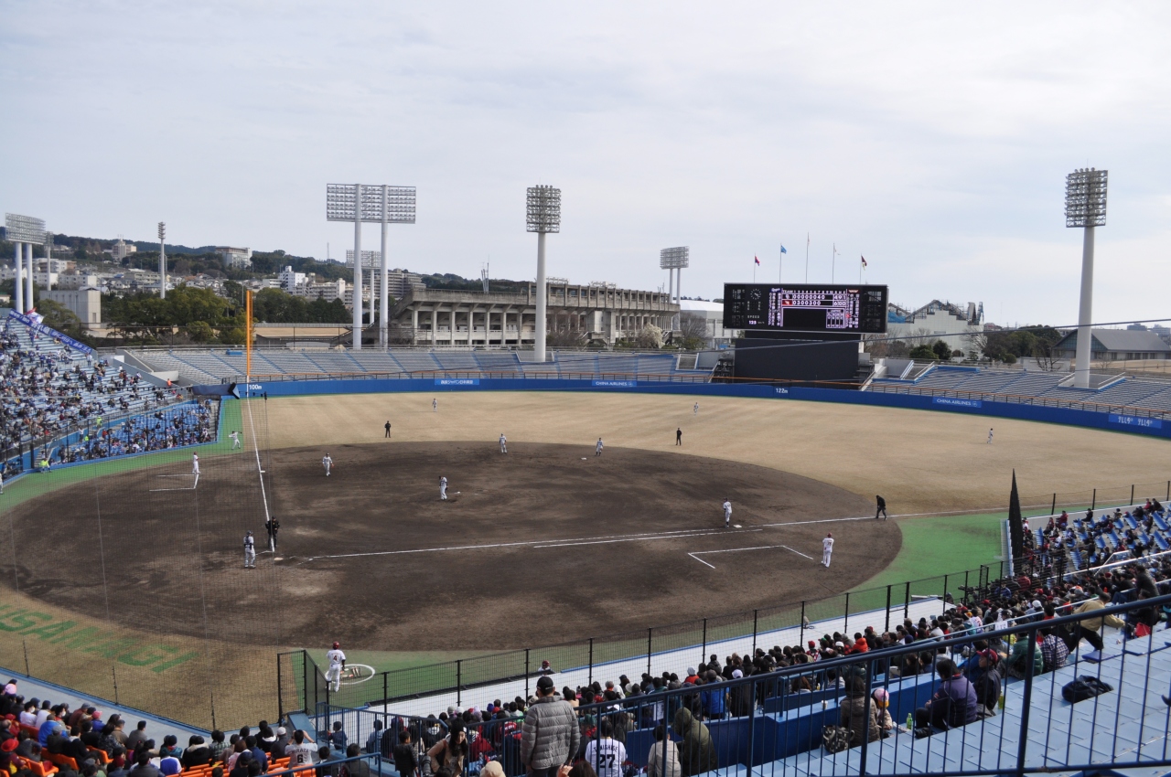 2016年3月にプロ野球オープン戦楽天vs中日戦の観戦で訪問。車で行ったのですが、運動公園の駐車場は野球観戦では使えないし、付近にコインパーキングもないし、えらい苦労しました。この球場は車で来たらダメな球場ですね。球場はというと、外野スタンドまで座席ができていました(以前は芝生でした)。今回は内野のバックネット裏だったのですが、やはり内野のいい席だと選手が近くていいですね。迫力ありました。球場の外ではラーメンの出店もたくさん出ており、楽しめました。