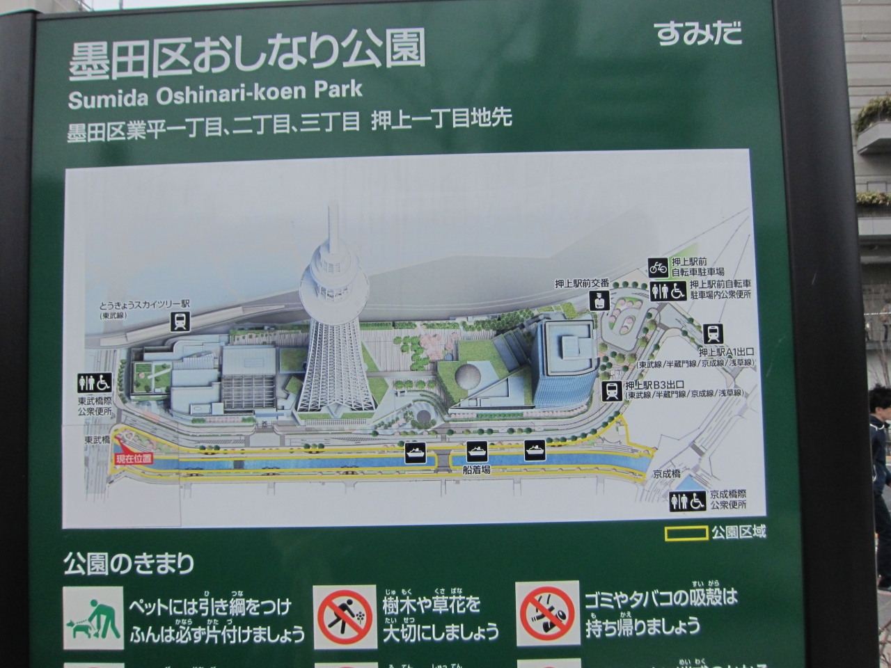 スカイツリーとソラマチから出ようと思わないとなかなか気づかないところかもしれません。正直特別何かがあるわけではないのですが、高角度から撮ると人物とスカイツリーがばっちり入る撮影スポットがあるのです。ソラマチを出て信号渡ると、そこが墨田区おしなり公園です。