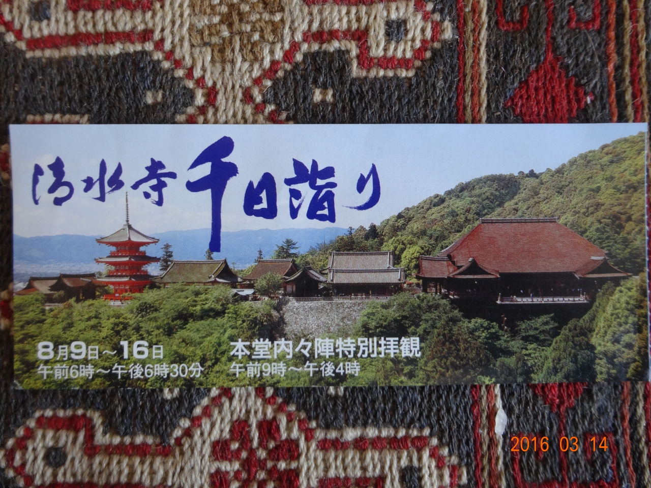 久しぶりに清水寺に行きましたが、相も変わらず大変な人の波である。清水寺に行く参道は何本かあるがどこも混雑していた。夏休みであったので当然かもしれない。目立つのは中国人が多くみな喜んで舞台の上で写真を撮っていた。日本の着物姿の若者たちが多かった。現在修復中のところが一部ある。丁度「千日詣り」あり、本堂内も特別に見学できた。