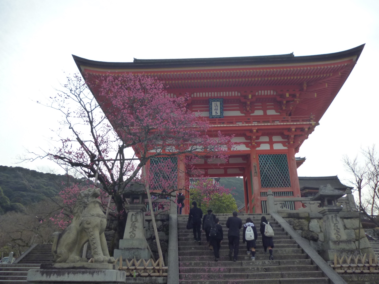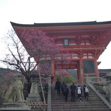清水坂を上りつめると、朱塗りの仁王門が太陽に輝いていました。9時頃着いたので、空いていました。ちょうど梅に花が咲いていて、きれいでした。ゆっくり眺めるために、少し早めの参拝をお勧めします。狛犬はどちらも口を開けていました。