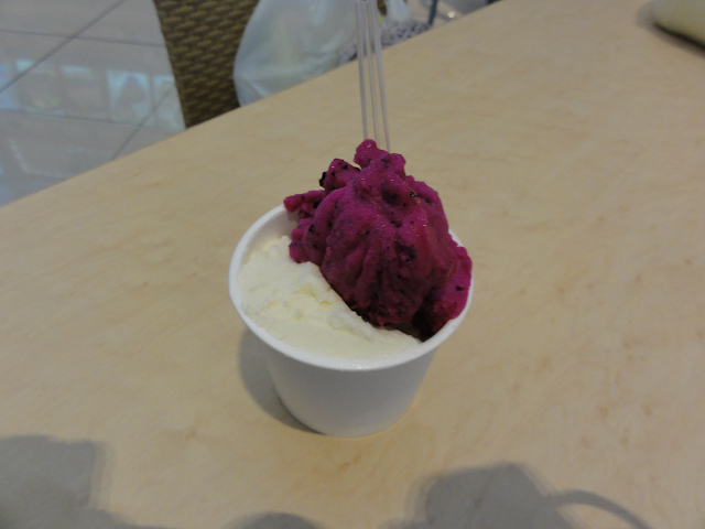 沖縄と言えばブルーシールのアイスの印象でしたが、1階フードコートの専門店はここでした。色とりどりのジェラートは石垣島産のフルーツや芋、島豆腐もありました。紅のドラゴンフルーツと島豆腐の2種類(¥370)を食べてみました。美味しかったです。